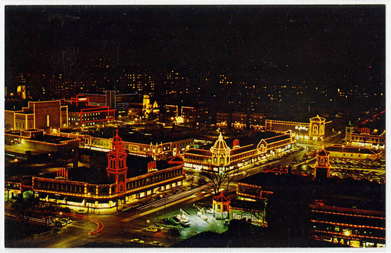 It harkens back to Christmas Day in 1925.The Plaza shopping center had been conceived by J.C. Nichols in 1912, when the area known as Brush Creek Valley was just an uninhabitable marsh with a nearby hog farm. Nichols, already a prominent real estate developer in areas south of Kansas City, believed that automobiles (and not electric streetcars) were the future of local transportation. The architects he hired, Edward Buehler Delk and George E. Kessler, therefore planned wide streets and allotted considerable space for parking.