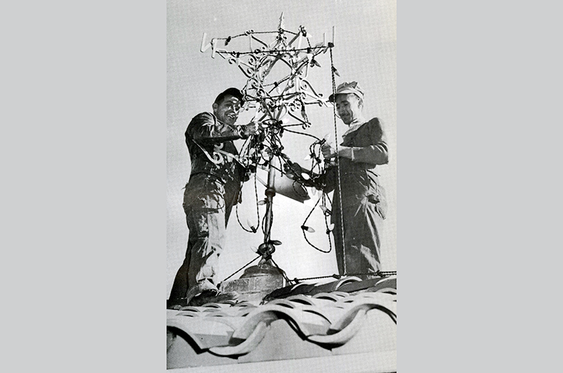 In 1925, Charles "Pete" Pitrat, maintenance supervisor for the Nichols Company, hung Christmas lights on the Mill Creek Building for the first time. The display was hardly impressive by modern standards: a few strands of lights over a doorway with some small Christmas trees arranged along the sidewalk.